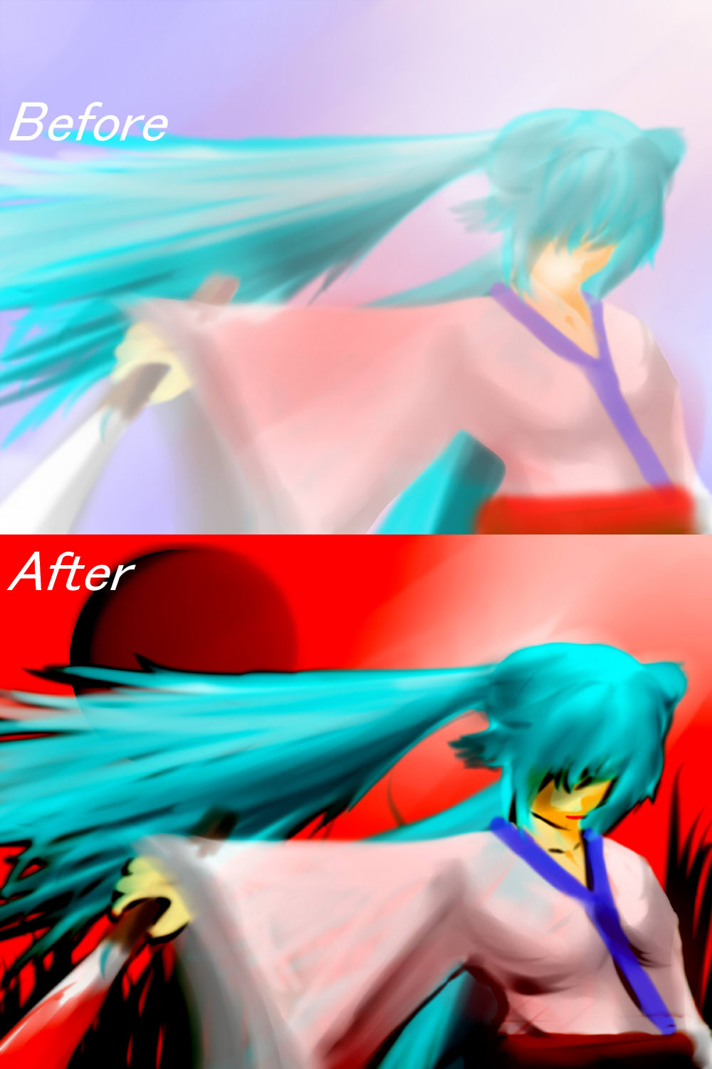 どうも、こんな時間に栞那さんです・ω・) 最近、 ・研究室行く→昼ごはん食べる→プログラム考える→→→夕飯食べる→院試のお勉強→帰る ・研究室行く→昼ごはん食べる→だらだらする→帰る のどちらかしかしてない気がする。そして帰った後はニコ生聞きながら絵を描いたり。勉強しろよ受験生← 本日のBGM:EMPTY / ゆよゆっぺ feat.巡音ルカ http://www.nicovideo.jp/watch/sm7863371 どうしようもないね(受験生的な意味で) ・・・・樹海行ってくるorz ゆよゆっぺ強化週間実施中← 曲の流れとか、テンポとか、歌詞とか、どれも大好き。ドラムっぽいあの音がいい。 それにしても何でこの動画こんな荒れてんだろう・・・(´・ω・) Φ さて、ちょっと筆の練習ついでに、ずーっと描きたかった着物ミクを描いてみました。 pixivで見る piaproで見る 筆ツールって楽しい。髪の毛が描きやすい← 着物をずーっと描いてみかったんですが、機会がなかったのとスキルがなかったのと。 ただ、筆の欠点として境界線がはっきりしないので、全体的ににじんだ感じになる。 ので。 こうしてみた pixivで見る piaproで見る 人物の直下のレイヤに、人物の輪郭に影をつけるイメージで黒を載せ、その後全体の上からオーバーレイで黒を足して影を強くしてみました。 背景が紅くなったのはノリです← 比べてみた どうしてこうなった\(^o^)/ PR COMMENTS無題(゚д゚ )乙 これは乙じゃなくてポニーテールなんたらかんたら