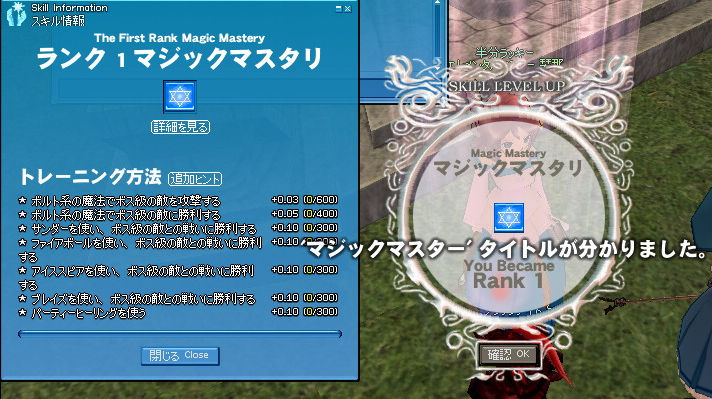 色々と書くことはあるんだけど φ たまにはマビのお話でも。 ┏─Battle Result──────── 栞那はレベルが上がった! アイススピアがランク2になった! エレメンタルマスタータイトルを習得した! マジックマスタリがランク1になった! ─────────After-Fairyland Fantasy──┛ というわけで、あいかわらず中級魔法戦士(※中級は魔法を修飾)の栞那さんですヾ(’’ あと一息です(>< アイススピアはもう修練100%超えてるんですけどね あとはAPのみ。次の転生までに70AP稼ぎたいところだが・・(´・ω・) Lv100と加齢と探検25でとか言う人はとりあえず焼肉屋さんで魚食ってればいいと思うよ ・エレメンタルマスター 何気に効果いいんですねこれ。防御+3はありがたい(’’ 魔法使いモードは紙だもの(´・ω・) マジックマスタータイトルが取れたらこのタイトル使わなくなるかもしれないが・・・w なんか地味に長かった(笑 姫サブのG8熱気球を手伝ったあとにマナトンネルで雑談しながらPTヒーリングを連打連打。 マジックマスター修練の分もあわせて380回ほどPTヒールやりました。疲れた!w 雑談こそネトゲの醍醐味☆ ギルメンからロリタヌを借りることができたので、THとIS、ついでにブレイズもなんとかなるはず。 ボルト系は言わずもがなとして、問題はFBL・・・RankFなんですよね('A`) ロリタヌ+深海鍋(+害篭手)で蟻がBOSSになるといいんだけどなぁ。 明日あたり試してみよう そいではおやすみなさい! PR COMMENTSCOMMENT FORM TRACKBACKSTRACKBACK URL |