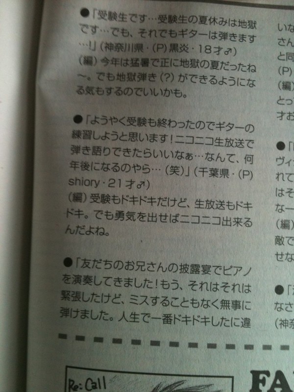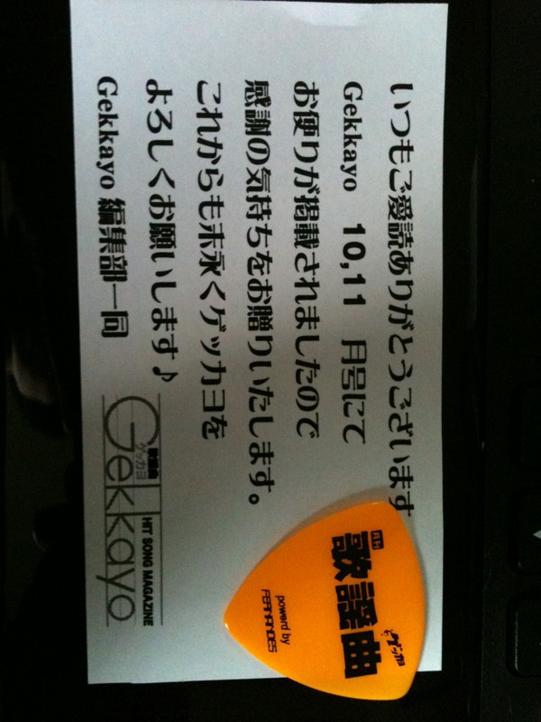 ようやくゼミが終わって、ついさっきまでMIXやっておりました。コラボ相手からOKもらえればアップできる勢いでございます! 本日のBGM:_theBlue / フカクボP feat.巡音ルカ http://www.nicovideo.jp/watch/sm12114782 ランキングに載ってて、サムネに惹かれて入って惚れました! これは歌いたいなぁ。格好いい・・・! 地声と裏声どっちがいいかなー。とりあえず覚えて、生放送で両方歌ってみようかなー Φ 今日の日記は、ゲッカヨとボーカロイド名曲百選にて。 メロ譜が載ってる音楽雑誌なんですが、前号、前々号から引き続き、ボーカロイド特集を組んでおります。 今回は「6大P 名曲選」ってことで、完全に俺得な特集をやってくれましたー! 個人的にツボだったのが ・minato(流星P) RIP=RELEASE SPICE! ・悪ノP 悪食娘コンチータ ・DECO*27 二息歩行 相愛性理論 ・家の裏でマンボウが死んでるP / 字も絵も下手っP 家の裏でマンボウが死んでる 18 ・ハチP 結ンデ開イテ羅刹ト骸 clock lock works ワンダーランドと羊の歌 Mrs.Pumpkinの滑稽な夢 リンネ ・ささくれP ワンダーラスト *ハロー、プラネット。 ぼくらの16bit戦争 趣味が偏ってるのは仕様です← 紹介しませんでしたが、悪ノPの曲、家裏マンPの曲はもうちょっとあります。あと、驚いたのが 般若心経ポップが載ってた これ、ボス曰く出稿の3日前に滑り込みだったらしい。ゲッカヨ本気だし過ぎです( ゚д゚)www その他、DECO*27さんと家裏マンPのインタビューと、KNOTS(若干P)さんのインタビュー、楽曲のメロ譜公開、千年の独走歌などなどなどなどなど!! そーいえばこのゲッカヨ、読者コーナーにハガキ載ってましたwwwwww そのせいか、後日ゲッカヨからピックが届いてました( ゚д゚)www 使わずに大事にとってありますヾ(*´∀`*)シ編集さんありがとうー! そうそう、ボカロばっか言ってますが、ニコニコで流行ってたゴールデンボンバーがカラーページで大暴れしてるんが面白かったです← JPOPも洋楽もいっぱい載っててこれで700円はギターマガジンより安ry ちなみに、メロ譜なのでコードと歌詞の音程が載ってます。tab譜じゃないです。 とりあえず今は、clock lock worksを練習中! Φ そして今日買ってきました ブティック社(ゲッカヨの会社)がやってくれました! やらかしてくれました! ボカロのメロ譜を100曲詰めたボカロ厨歓喜な1冊! なんとDearとダブルラリアットのバンドスコアもあるんだぜ! これすっげーぜ! 100曲中、気になった曲を抜粋。 サルでもわかるアゴアニキ 方向音痴 / アゴアニキ よっこらせっくす / アゴアニキ 家の裏でマンボウが死んでる / 家の裏でマンボウが死んでるP 炉心融解 / iroha 害虫 / 鬱P ユートピア / 絵師じゃないKEI IMITAITON BLACK / natsuP 恋スルVOCA@LOID / OSTER PROJECT ダンシング☆サムライ / かにみそP 君の体温 / クワガタP Packaged / kz StargazeR / 骨盤P サイハテ / 小林オニキス ぼくらの16bit戦争 / sasakure.UK *ハロー、プラネット。 / sasakure.UK Genesis / ジミーサムP メランコリック / Junky 指切り / すこっぷ 1925 / T-POCKET 二息歩行 / DECO*27 夕日坂 / doriko ペテン師が笑う頃に / 梨本うい ハロ/ハワユ / ナノウ(ほえほえP) 疾風 / のりぴー 結ンデ開イテ羅刹ト骸 / ハチP ワンダーランドと羊の歌 / ハチP リンネ / ハチP 孤独の果て / 光収容 eight hundred / ピノキオP Alice / 古川本舗 1/6 -out of the gravity- / ぼーかりおどP ハジメテノオト / malo RIP=RELEASE / minato えれくとりっく・えんじぇぅ / ヤスオP Palette / ゆよゆっぺ Step to you / 40mP 裏表ラバーズ / wowaka ローリンガール / wowaka ワールズエンド・ダンスホール / wowaka タワー(tab譜) / 絵師じゃないKEI サラリーマンのうた(tab譜) / 彩音~xi-on~ Just Be Friends(アレンジ) / Dixie Flatline from Y to Y(アレンジ) / ジミーサムP ダブルラリアット(バンドスコア) / アゴアニキ Dear(バンドスコア) / 19's sound factory 太字で書いたのは栞那のテンションが上がった曲ですヾ(*´∀`*)シ ゲッカヨさんいい仕事しすぎ! ハロハワユと1/6とFYtYは絶対弾けるようになる! とりあえず、見てわかるように、新参古参関係なく楽しめるボカロ集でございます。ボカロ知らない人に曲を薦めるときはこれに載ってる曲を薦めれば間違いないってレベルの曲が沢山。 楽器持っててボカロ好きならぜひ買うべき1冊! と信じてる! それにしても、当分練習する曲には困らなそうです・・・というか多すぎて心が折れそうだだだ_ノ乙(_ン、)_www PR COMMENTSCOMMENT FORM TRACKBACKSTRACKBACK URL |